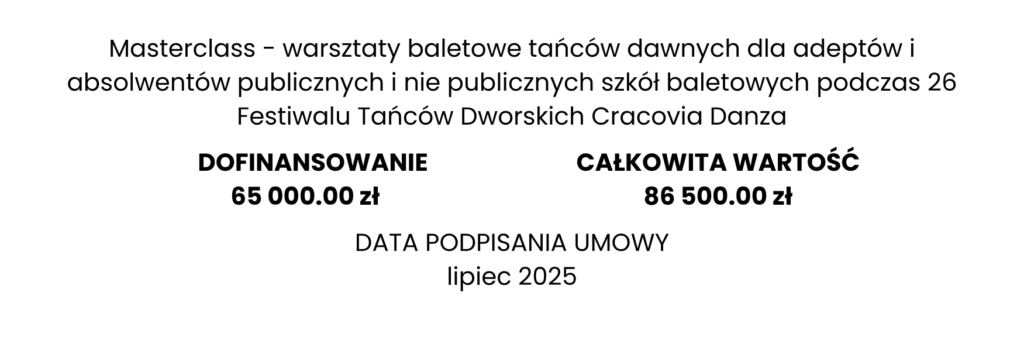 W tegorocznej edycji 26 Festiwalu Tańców Dworskich 2025 zapraszamy do uczestnictwa w naszej formule edukacyjnej. Jest to „Masterclass Baletu Dworskiego” – kurs proponowany dla uczniów Ogólnokształcących Szkół Baletowych. W ramach naszych kursów proponujemy: